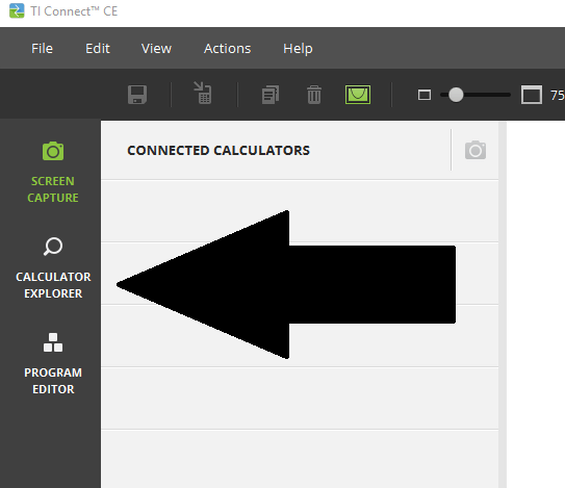 Step Two: Open TI Connect CE, and click the “Calculator Explorer” tab on the sidebar. Plug your calculator into your computer using your charging cable. Turn on your calculator.