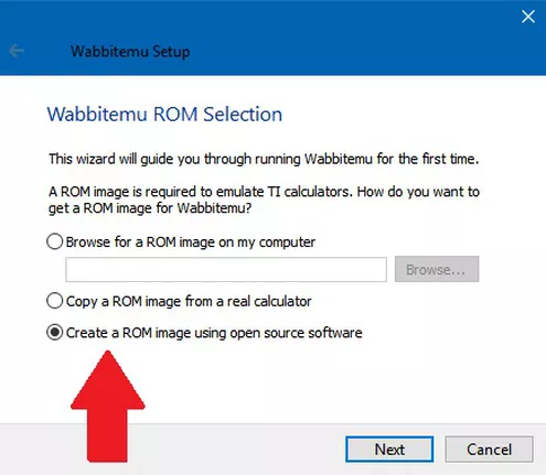 Step Two: When the “Wabbitemu ROM Selection” screen shows up, select the “Create a ROM image using open source software” option, and click next.