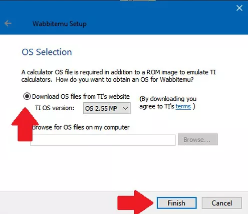 Step Four: On the OS selection screen, the best option is just to click “Download OS files from TI’s website”, and press Finish. This way, you don’t have to worry about downloading it manually.