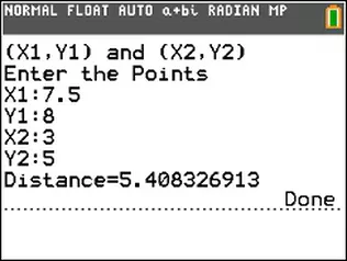 All you have to do is enter the coordinates of the two points for which you would like to find the distance between. For example, to find the distance between (7,8) and (3,5), you would enter 7 as X1, 8 as Y1, 3 as X2, and 5 as Y2. The program would then return your answer, which would be 5 in this case.