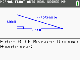 This is possible through a combination of the Pythagorean theorem and the trigonometric functions. The program also features an easy to use interface, with a diagram to help you figure out where each angle and side is located. The program is designed for the TI-84 Plus CE and TI-84 Plus C Silver Edition graphing calculators.